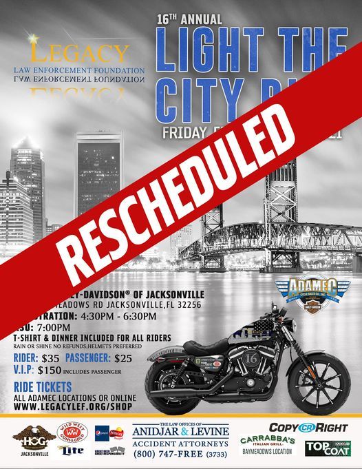 The 16th annual Light the City Ride Benefiting The Legacy Law Enforcement Foundation will be held February 19th 2021. Friday leaving out of Adamec Harley-Davidson 8909 Baymeadows RoadRegistration is. National Presenting Sponsor of Survivorship Hope.